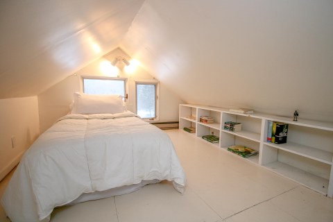 The spacious Master Bedroom is large enough to include a seating area. It also has a vaulted ceiling with skylight, wall of windows with custom indoor shutters, and a claw-foot tub in the ensuite bath. The 2nd bedroom is a loft room w/ more custom shelving and windows facing the backyard.