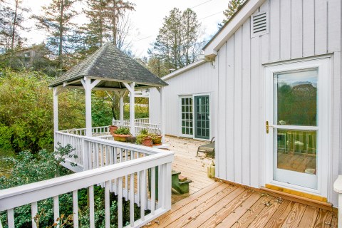 The large deck on the back of the house is designed for entertaining & gatherings w/ multiple seating areas, a covered Gazebo, and wide steps connecting to the large backyard.