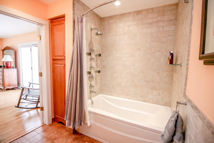 The large Master Bedroom has an updated en-suite bathroom w/ large tub and shower w/ body jets to complement the overhead faucet.