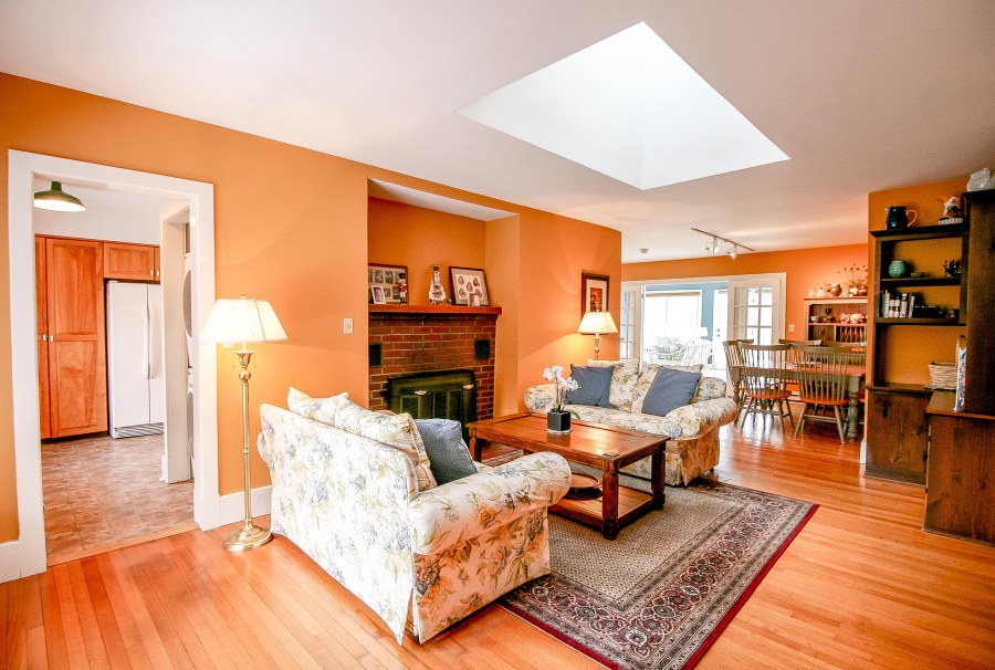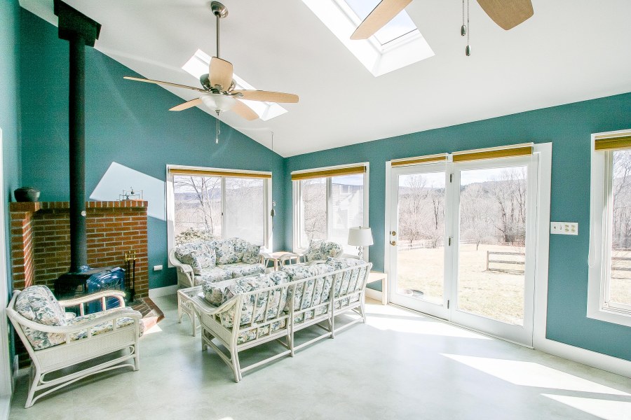 An addition to the original house is the light-filled, Year Round Sunroom/Family Room with a wet-bar, Cast Iron Stove, wall of windows & 3 more Skylights.