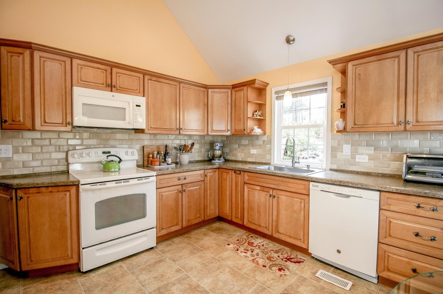The Eat-In Kitchen also has vaulted ceilings & features custom cabinets, ample counter space & sliding glass doors leading to one of two decks.